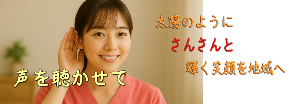 私たちが大切にしている理念「声を聴く」とは、ご利用者様や支えておられるご家族様の内に秘めている本当の声に耳を傾けること、そして、スタッフひとりひとりの声にも耳を傾けることを大切にしています。「声がある限り寄り添っていく」ことをモットーに、みんなの「声を聴く」ことで、さんさんリハビリ訪問看護ステーションにかかわるみんなにさんさんと輝く太陽のような笑顔があふれることを願っています。